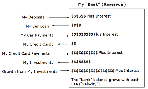 A reservoir of liquid money (available without tax or penalty) is created by finding and using available resources. (We can help you do this.) Following the principle of “money should flow to its greatest value (use)”, and applying sound economic principles, this reservoir of money is used as a personal “bank”. (We can help you do this too.)